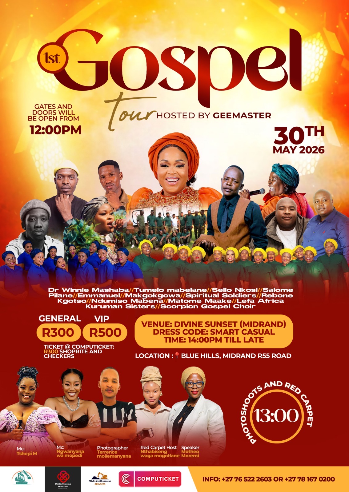 Join us for an unforgettable day of high-energy gospel music, heartfelt worship, and inspirational messages at the 1st Gospel Tour with GeeMaster. Bringing the Sione community together in joy, this family-friendly event features soulful live vocals, powerful performances that foster healing and unity, and opportunities for spiritual rejuvenation. MCs Tshepi M and SfisoTheStylist will host proceedings, with red carpet hosted by Nthabiseng Magotlone. Doors open at 12:00 PM at Blue Hills, Midrand. Performing artists will be announced soon. All ages welcome.