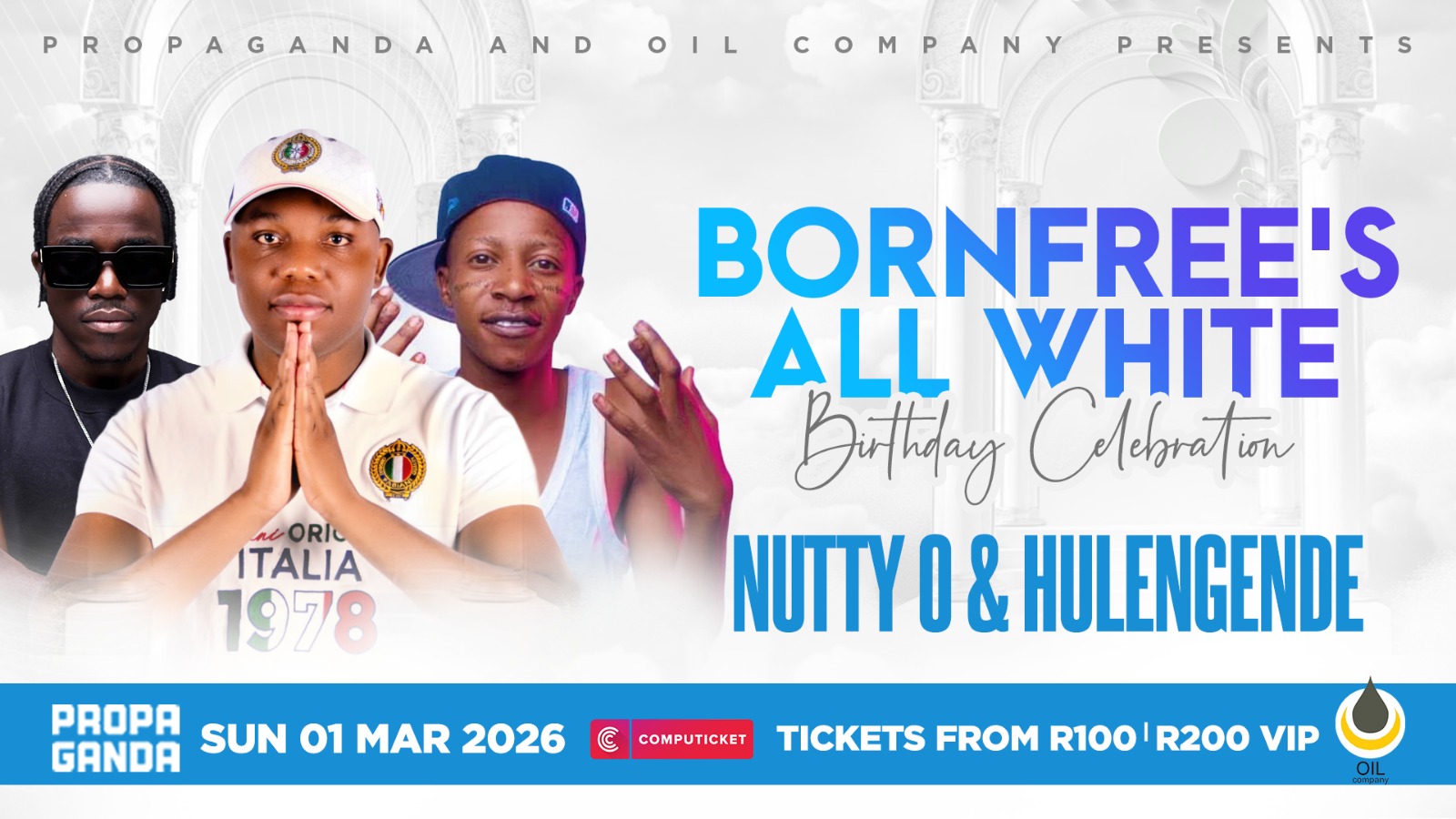 Step into a world of pure elegance for Bornfree's birthday ? an exclusive all-white soir¿e at Propaganda Pretoria. On March 1, 2026, doors open at 4 PM for an evening of vibrant energy, stunning live performances, and a captivating atmosphere. Dance the night away until 4 AM as we celebrate Bornfree with sensational sets from Nutty O and Hulengende. Dress to impress in your finest all-white attire and join friends for laughter, dancing, and unforgettable memories at one of Pretoria's premier venues. Tickets are limited ? secure your General or VIP ticket now to ensure you don?t miss this legendary celebration.