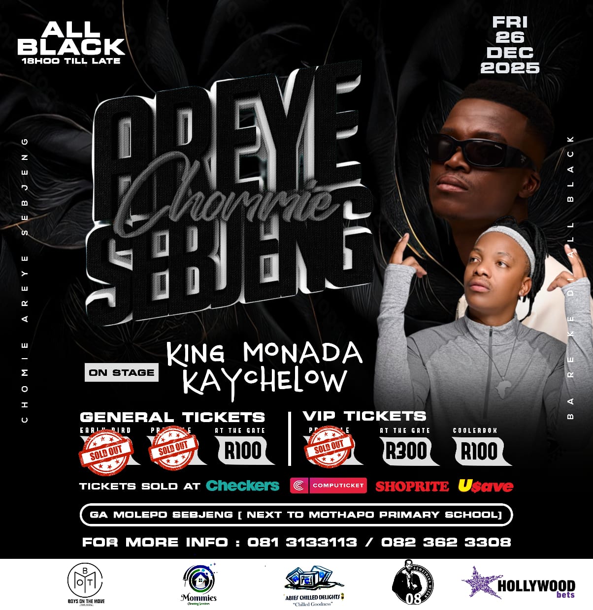 Join us for Chomie Areye Sebjeng ? an unforgettable All Black party on December 26, 2025. The event kicks off at 12:00 PM and runs into the early hours of December 27, 2025 (until approximately 6:00 AM) at Sebjeng Liquor and Grocery in Polokwane, Limpopo. Expect live music performances, energetic dance showcases, DJ sets keeping you on the dance floor, delicious food and drinks, and late-night entertainment. Whether you love music, dance, or a great night out with friends, Chomie Areye Sebjeng promises memorable moments and non-stop celebration. Limited capacity ? secure your General or VIP ticket early for priority entry and all-access perks. Bring a valid ID; this is an 18+ event. Dress code: All Black.