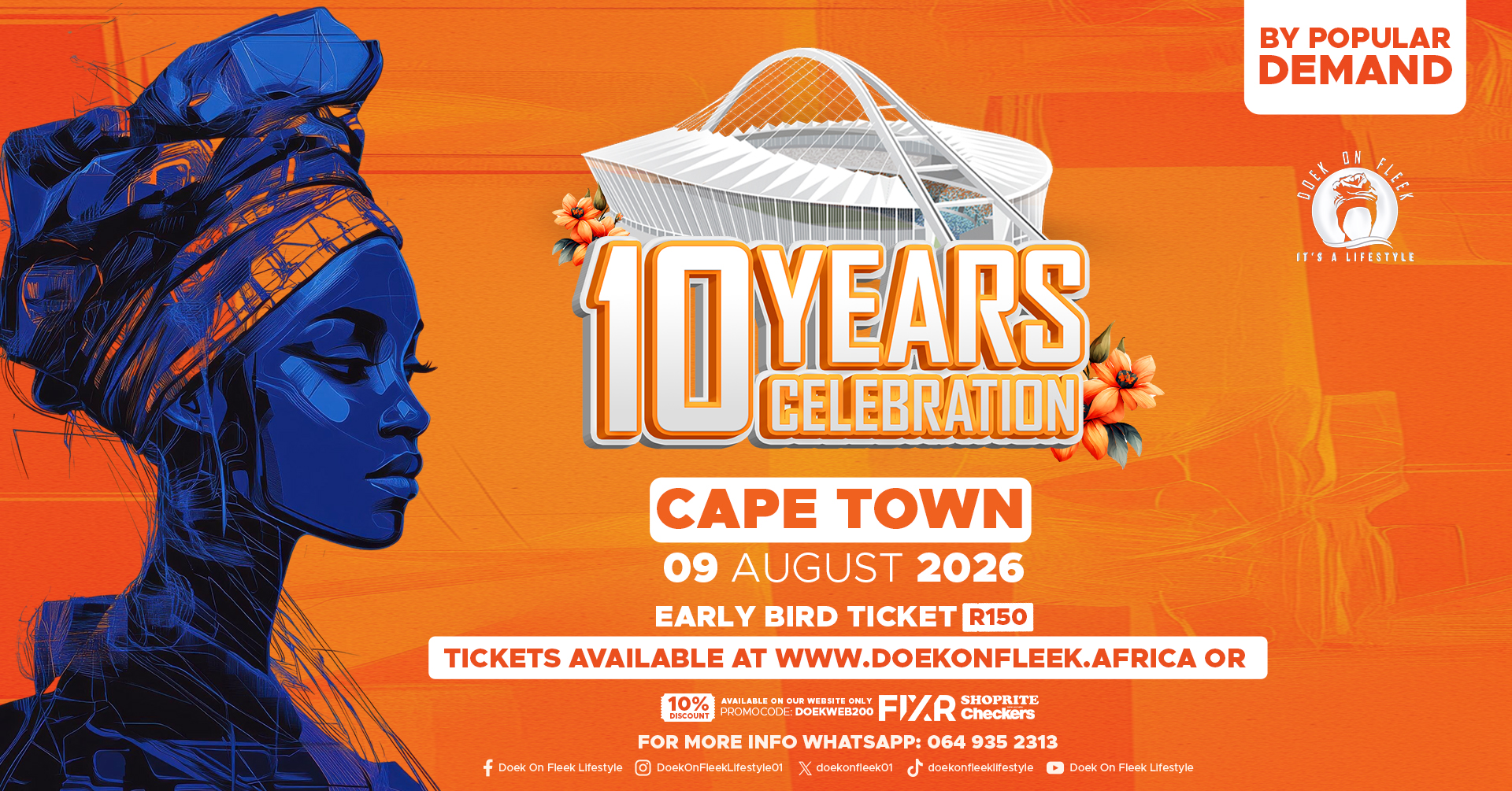 Doek On Fleek presents Doek Nation 10 Year Celebration ? a women-only Women's Day picnic and lifestyle festival in Cape Town on 9 August 2026. Celebrate womanhood, empowerment and connection with a day of live entertainment, motivational talks, laughter, giveaways and community. Tickets: Early Bird R150; General Access phases R200 / R250 / R300. Cooler box fee R150 (0-45L coolerbox tickets available for cans only). Bring a cooler box (fee applies), folding chairs, picnic basket, your doek and a gazebo or umbrella. Tickets available at Shoprite, Checkers and Computicket. For inquiries WhatsApp 0649352313. For trading/food stalls contact Lina at 073 485 3216. Strictly women-only ? no men, no children. Not allowed: weapons, drugs or glass bottles. Join Africa?s most talked-about movement to unite, support and empower women while creating unforgettable memories.