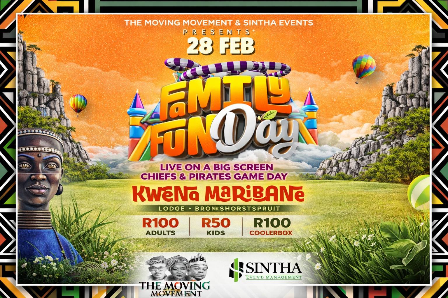 Family Fun Day 2026: Games, Music & Chiefs vs Pirates. Get ready for an unforgettable experience at the Family Fun Day 2026, proudly brought to you by The Moving Movement and Sintha Events. Join us from February 28th to March 1st at the stunning Kwena Maribane Lodge in Bronkhorstspruit, Gauteng. Bring your loved ones for exciting games for all ages, live music performances, delicious food and beverage options, exhibitors and stalls, and the thrill of cheering during the Chiefs vs Pirates match. Secure your tickets early ? there?s something for everyone and it?s the ultimate family celebration of community, joy and bonding.