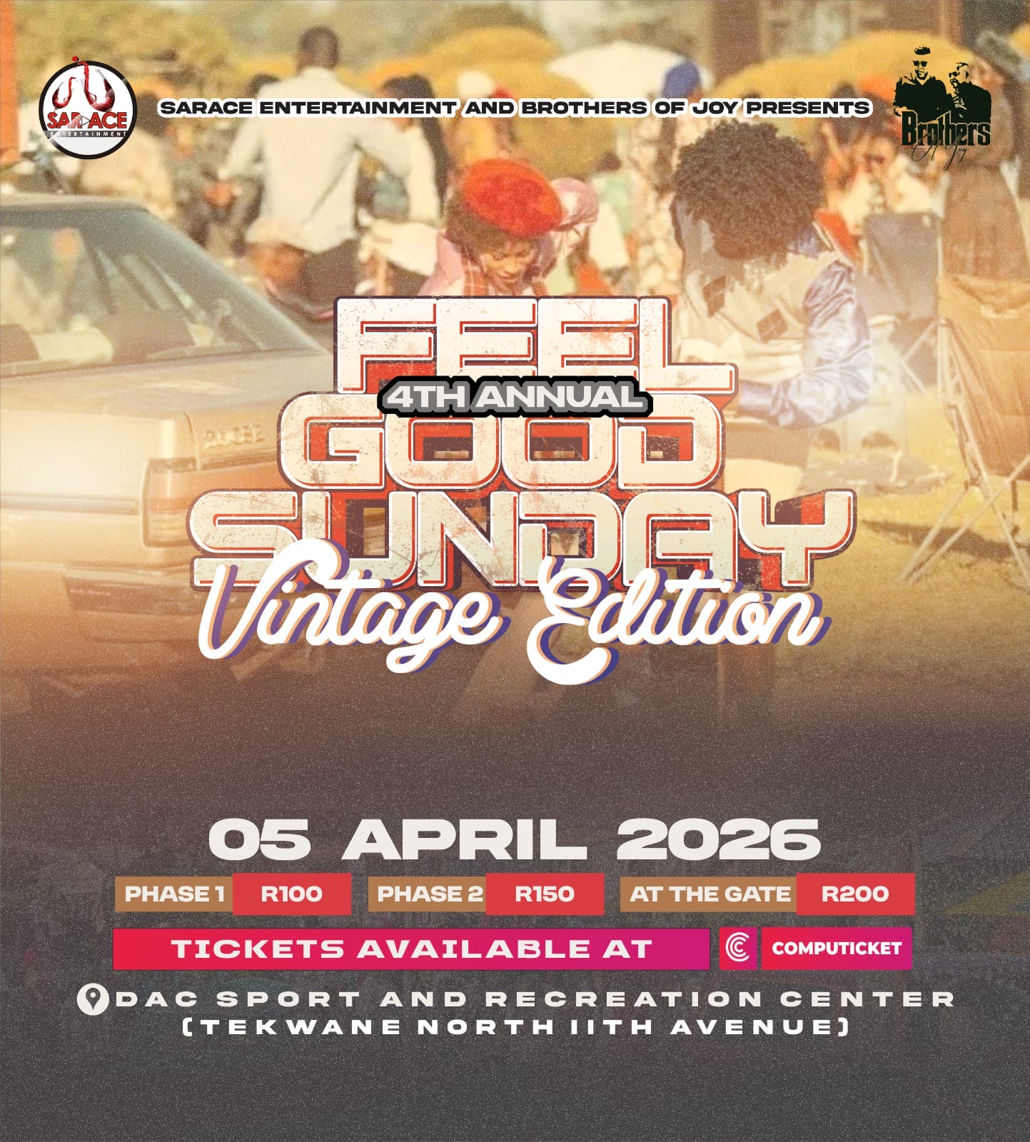 Join us for Feel Good Sunday Vintage Edition on April 5, 2026 at Eleventh Avenue in Tekwane North, Mpumalanga. Experience the vibrant Kofifi culture with live performances from talented local artists, a vintage market showcasing unique treasures, delicious food stalls offering a variety of cuisines, and interactive activities for all ages. From noon until midnight the venue will come alive with music, dance and nostalgic charm ? perfect for friends and family looking to unwind and create lasting memories. Early Bird tickets include free parking; grab your tickets now and be part of an extraordinary celebration of community, music and togetherness.