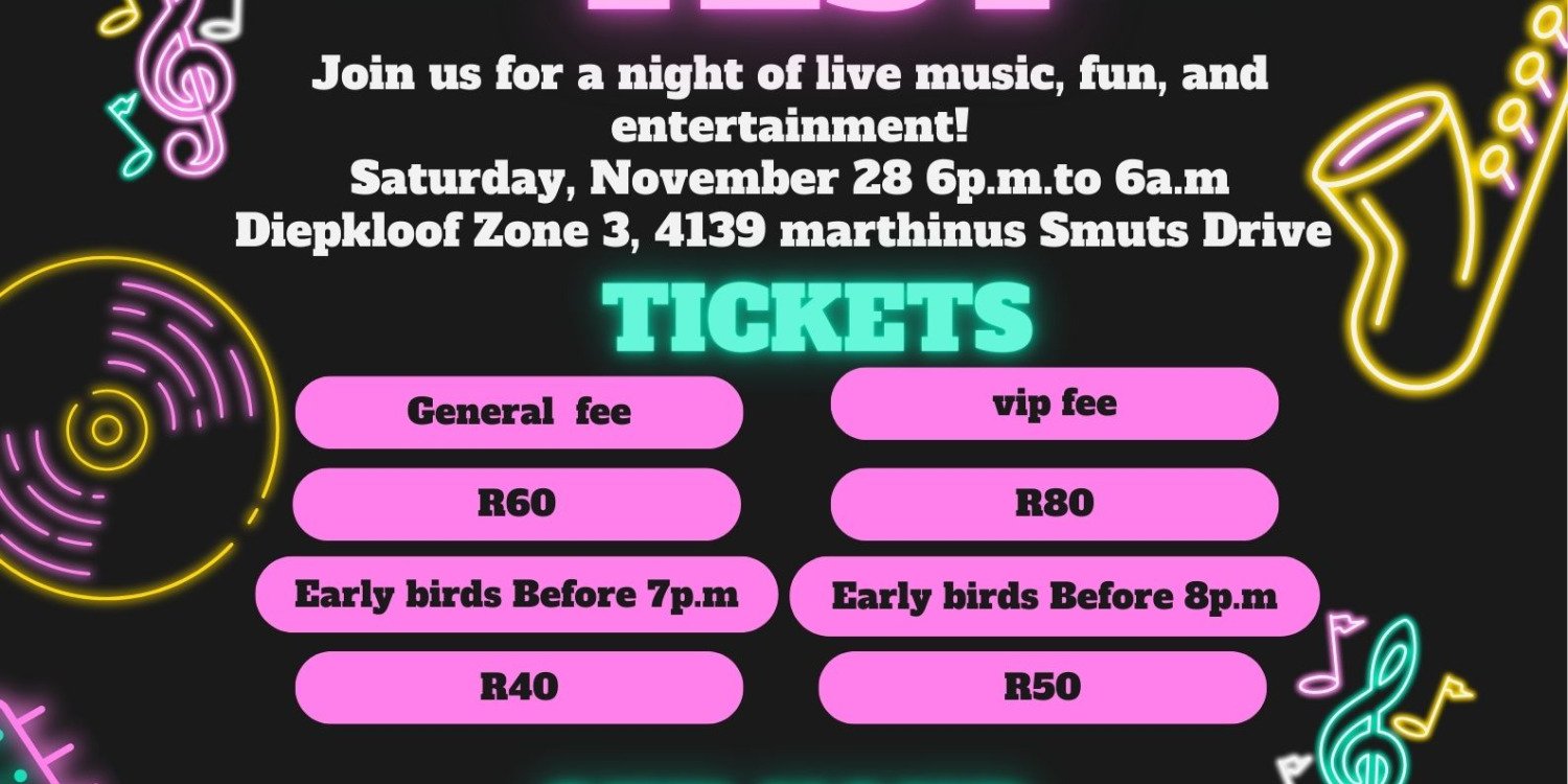 Welcome to Funky Fest! Get ready to immerse yourself in a vibrant celebration of music, dance, and culture at Funky Fest. Taking place on November 28, 2026 at 4139 Marthinus Smuts Drive, Diepkloof Zone 3, this event features an electrifying lineup including Mpekzin dasoul, Mr 256 official, Djy sami, KOMDA'PERC, Djy Steezy and The wave duos. Enjoy high-energy beats, soulful melodies, delicious food vendors and a fantastic atmosphere. Tickets are wallet-friendly ? purchase your ticket now to secure your spot, connect with fellow music lovers and dance the day away!