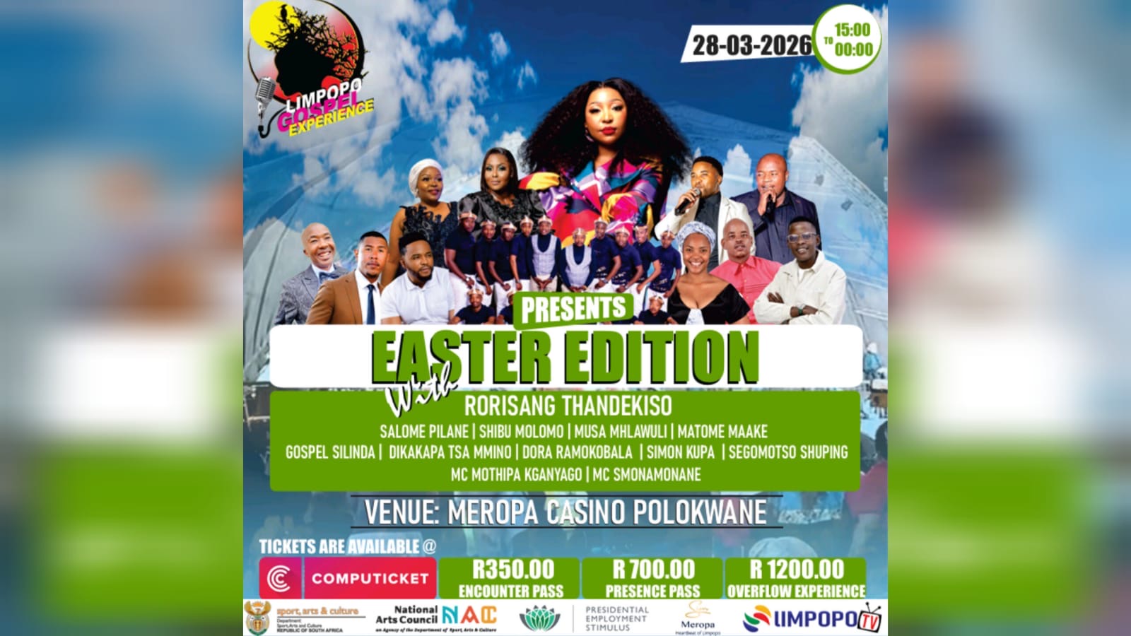 Join us for a powerful and uplifting Easter Edition of the Limpopo Gospel Experience, featuring the anointed and celebrated gospel artist Rorisang Thandekiso and many more. Experience a day of inspiring worship, uplifting performances and community celebration at Meropa Casino & Entertainment World in Polokwane on 28 March 2026 from 13:00 to 22:00. Choose from Encounter Pass (general seating, bottled water), Presence Pass (priority seating, light meal & refreshments) or Overflow Experience (dinner, reserved seating next to the stage & meet-and-greet). This family-friendly event is suitable for all ages. Secure your seats for a divine Easter experience and enjoy an evening of powerful gospel music and fellowship.