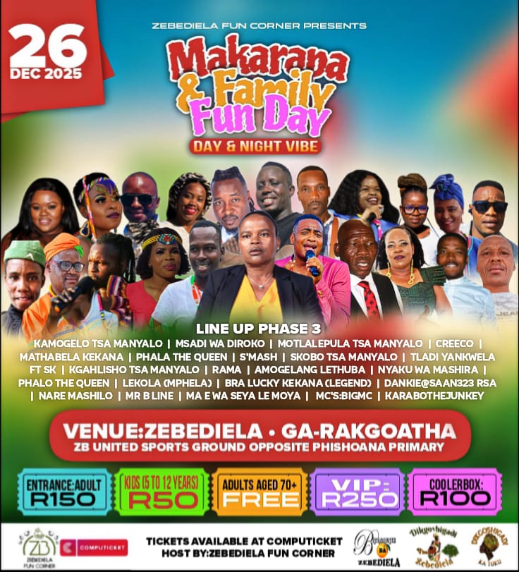 Makarapa & Family Fun Day ? Join us on 26 December 2025 at Phishoana Primary School in Zebediela for a fun-filled celebration of Makarapa traditions, featuring live Manyalo and Lekompo performances plus engaging activities for children. The family-friendly event runs from 10:00 AM (SAST) on 26 Dec until 10:00 AM on 27 Dec, offering music, dance, and community celebration. Tickets are available in VIP, General and Children categories. Bring blankets, sun protection and the whole family for a lively cultural experience and lasting memories. For venue and accessibility details, contact the event organizer.