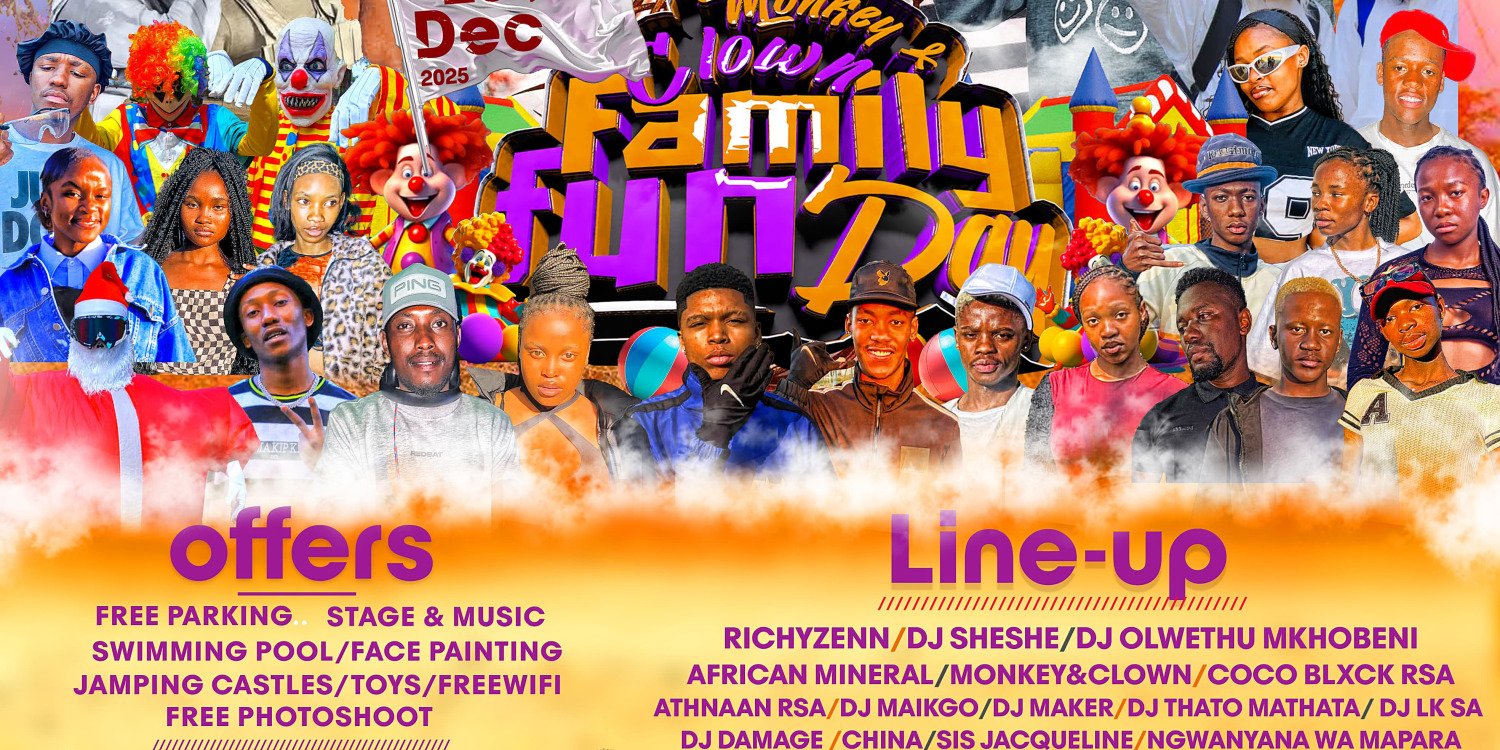 Monkey and clown family fun day picnic at Rooikraal Village. Monkey and clown family fun with sounds, pool, a special guest celebrity, and a jumping castle ? perfect for kids and families. Bring a picnic blanket, enjoy food vendors, family activities and live entertainment from Richyzenn and various performers. The event runs on 25 December 2026 from 10:00 to 21:59 at Maile Street, Boitekong, Rustenburg. No refunds. Parking is available at Maile Rooikraal community hall. Suitable for all ages.