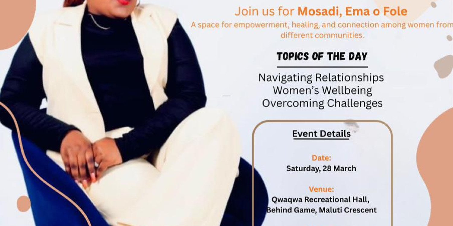 MOSADI, Ema O Fole!! ? Join us for an unforgettable Women's Conference on March 28, 2026, at Maluti Crescent (Mampoi Road, Phuthaditjhaba, Free State). The event runs from 11:00 AM to 5:00 PM local time and offers a vibrant day of empowerment, healing and connection for women across communities. Immerse yourself in captivating performances, local cuisine, and heartfelt community spirit. Sessions will cover navigating relationships, women?s wellbeing and overcoming challenges, led by speakers and facilitators focused on practical tools and personal growth. Bring friends and family to celebrate, learn and connect ? tickets are limited, so secure yours today and be part of a life-changing experience.