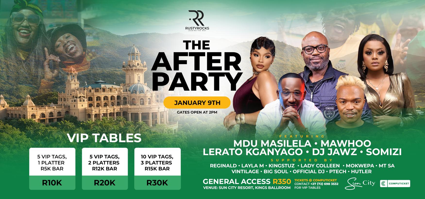 The After Party ? an elegant evening filled with dance music and live artist performances, tailored to have you dancing throughout the night. Join Rusty Rocks Events at Sun City Resort on 9 January 2026 for a high-energy after party with General Access tickets available. Line up to follow.