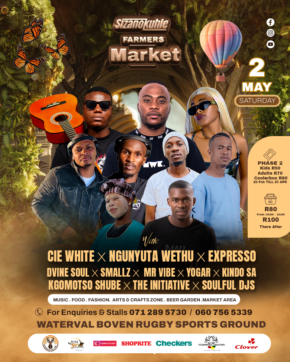 Sizanokuhle Farmers Market ? Join us on April 25?26, 2026 in Waterval Boven (Emgwenya), Mpumalanga for a vibrant two-day community market. Open 10:00 AM to 5:00 PM each day, the market showcases fresh organic produce from local farms, handcrafted artisanal goods, tasty offerings from food trucks and stalls, live music from local performers, and family-friendly activities. Stroll the stalls, support local vendors, discover unique gifts, and enjoy a lively daytime atmosphere perfect for friends and families. Buy early-bird tickets for adults and kids, or pick up a cooler box pass to bring your own refreshments. Experience the celebration of sustainability, creativity and togetherness ? get your tickets now and be part of this unforgettable weekend.