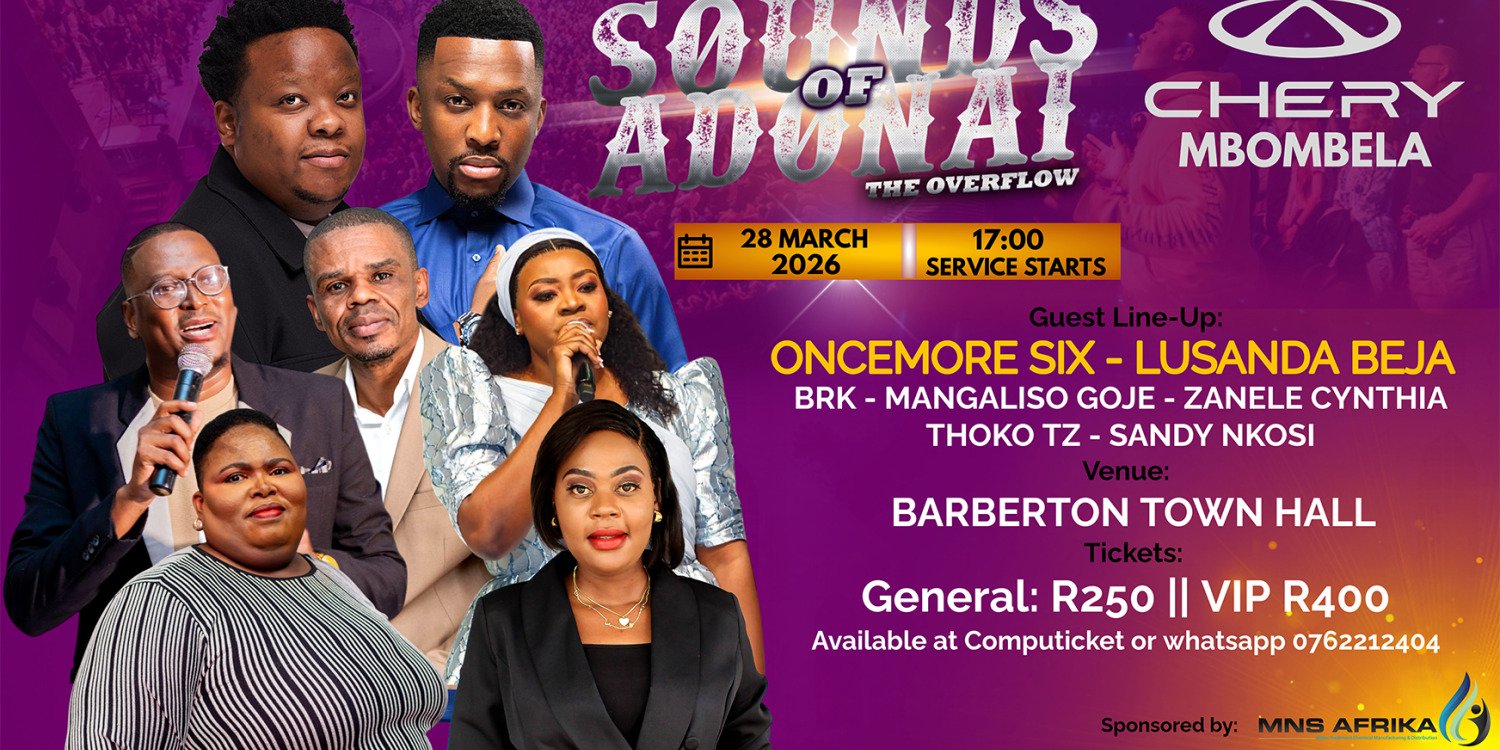 Join us for Sounds of Adonai - The Overflow on 28 March 2026 at Barberton Town Hall. This evening of musical worship runs from 5:00 PM to 10:00 PM (local time) and features an inspiring lineup: Oncemore Six, Lusanda Beja, Zanele Cynthia, BRK, Mangaliso Goje, Thoko TZ and Sandy Nkosi. Experience soulful melodies and uplifting performances in a welcoming community atmosphere. Barberton Town Hall provides a spacious setting to connect with fellow worshippers and music lovers. Tickets are available as VIP (R400) and General (R250) ? seats are limited, so secure your tickets today for a memorable night of praise and live music.