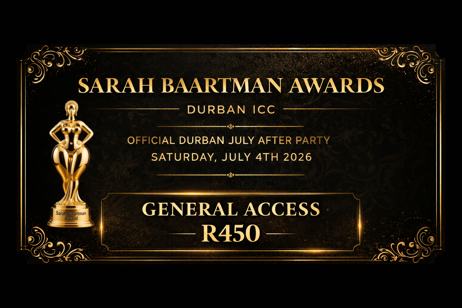 Sarah Baartman Awards 2026 ? Honouring Boldness, Beauty, and Brilliance. The Sarah Baartman Awards celebrate excellence across arts, lifestyle, entrepreneurship and social impact, positioned as Durban?s premier awards gala and the official After?Party of the Durban July Horse Race. Join us on 4 July 2026 at the Durban International Convention Centre for a night of awards, a Global Inclusive +Size Fashion Runway (10 selected models), live performances, networking, and an after?party with DJs. Ticket options include General Admission (R450), VIP (R1,200) and VVIP/Hospitality (R3,500). Program highlights: Red Carpet, Welcome Drinks & Networking, Global Fashion Runway, Award presentations, live entertainment, VVIP Meet & Greet, and After?Party/DJ set. Nominate plus?size models globally; contact Event Director Mondli Ndimande at ndimandemondli@gmail.com.